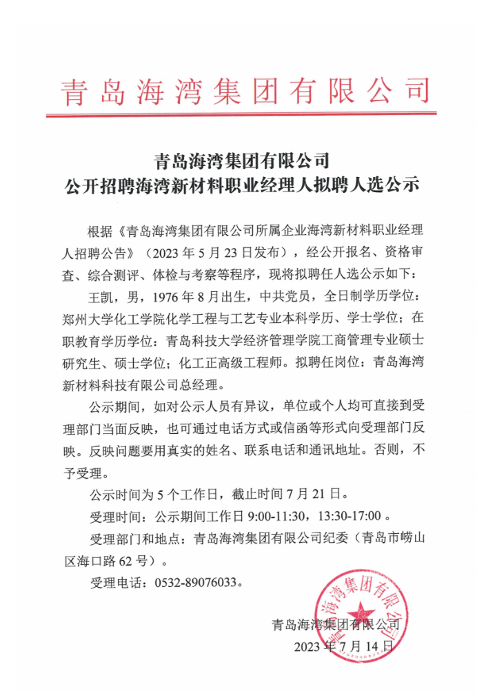 顶 青岛爱游戏官方网站有限公司公开招聘海湾新材料职业经理人拟聘人选公示