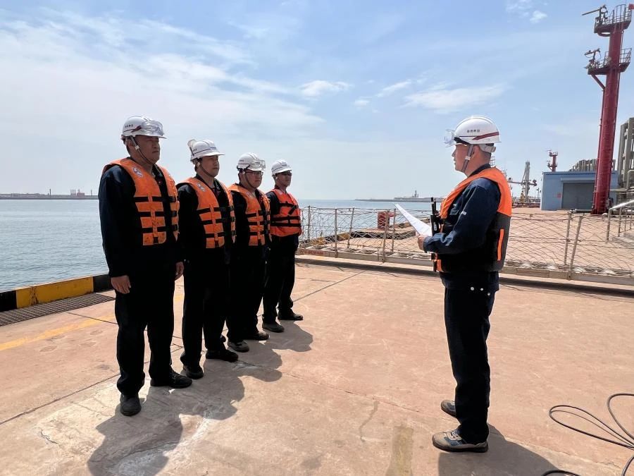 他们反复推演高干舷状态下输料臂的对接角度,通过船长和码头系缆柱位置测算出船舶带缆受力角度,确定系缆位置,力求在每一个环节都做到万无一失。码头上,职工们正在做最后的准备工作。每个人都知道,面对这艘"大家伙",容不得半点马虎。
