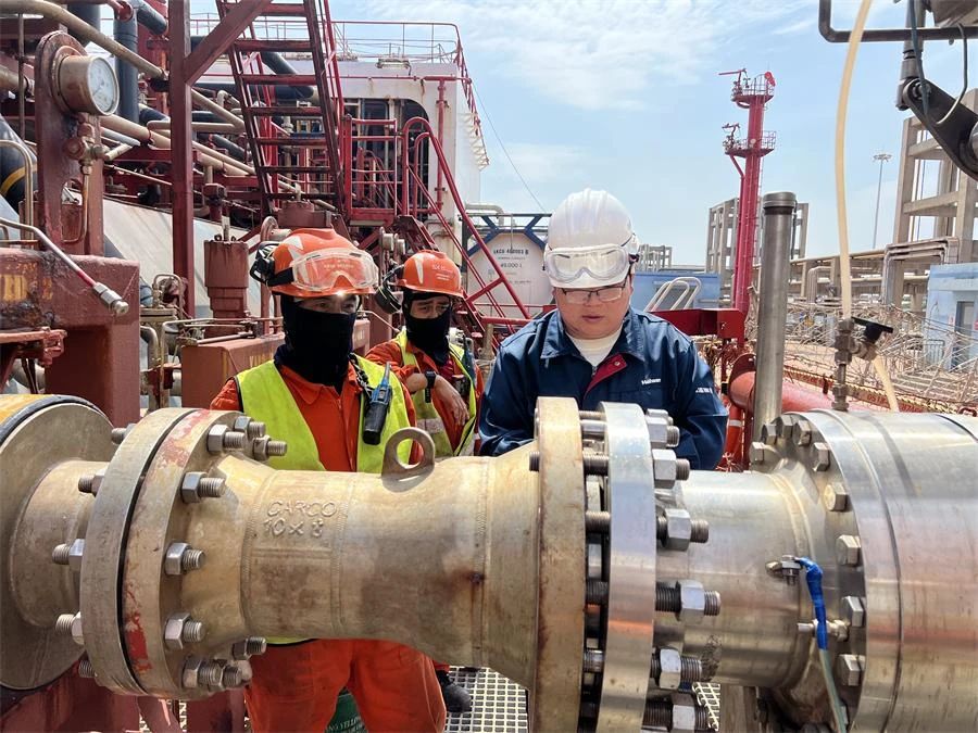 17:00,交接班刚结束,班长王路兴立即进行部署:”杨海负责输料臂和管线阀门检查,于凯准备防护装备和作业工具,其他人分两组就位船头船尾待命。”指令简洁有力,团队即刻进入备战状态。夕阳下,HW1#泊位作业区忙碌起来······