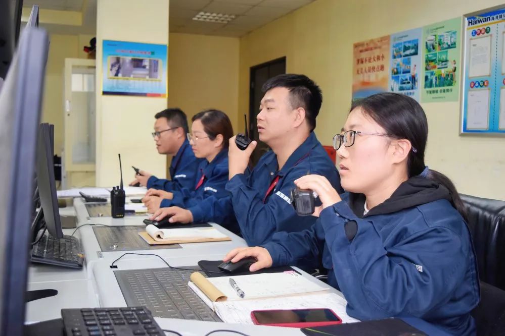 董家口港海湾港务的码头依然船来船往。自4月30日“哈夫尼绿松石”轮靠泊算起,海湾港务职工已连续奋战了53个小时,成功完成2万余吨液体烧碱的装船任务。刚刚送走奔赴沙特朱拜勒港的“哈夫尼绿松石”轮,装载着4900吨乙烯的“宏利”轮又传来提前到港的消息。值班长王路兴立即分配任务,接卸工作有序展开。技术骨干毕高阳穿过管廊逐一复核每个阀门的状态。现场调度员李连旺手持定位旗与船方协调定位带缆,25毫米粗的缆绳在绞盘机轰鸣中蛇形游动。“左舷二缆松两米。”“后桩收紧三十公分。”在海湾港务现场操作人员精准指挥下,仅仅用时18分钟,“宏利”轮便完成靠泊,开启接卸作业模式。