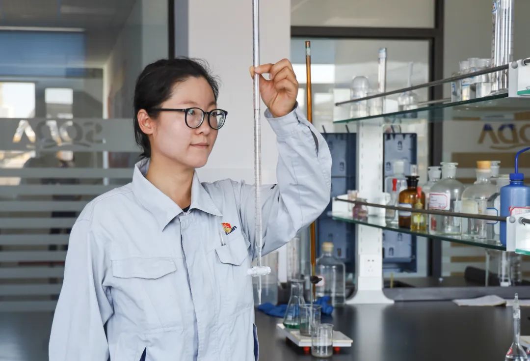在碱业发展质量监督部的实验室里,陈双正专注地进行滴定实验,滴定管上的数值关乎着一批小苏打产品的总碱量精度,这个场景是她14年质检生涯的日常缩影。自2018年入职以来,陈双以专业和热情投身化学检验工作,从一名质量监督员成长为质监主管,对质量的极致追求始终未变。