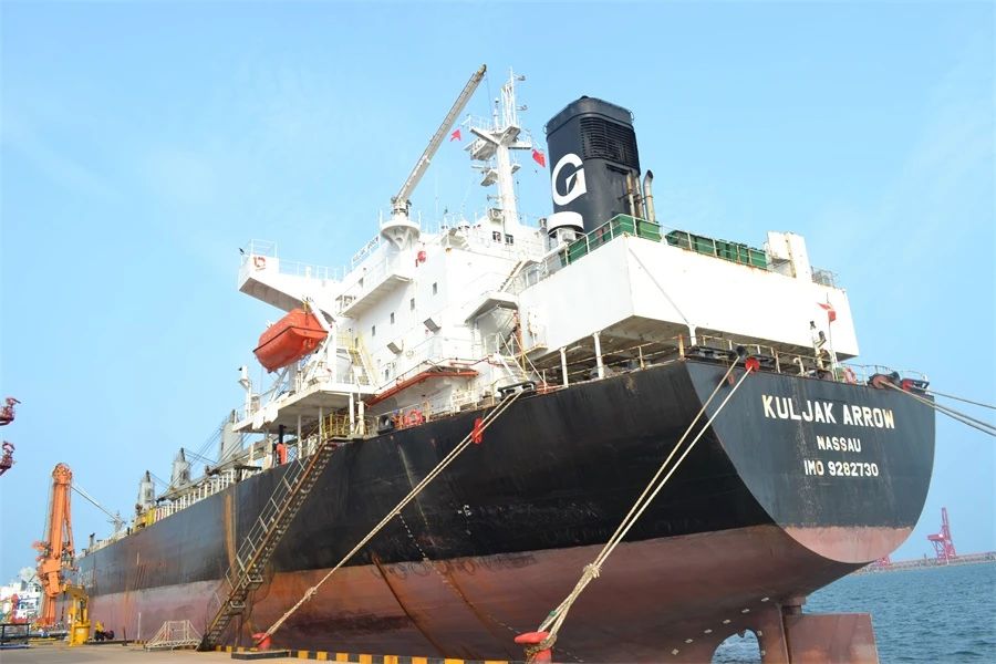 8月6日,海湾港务HW1#泊位成功实现首艘“两用轮”—— 长达190米、宽32米,载重吨 44471 吨的 “库里亚克之箭”(KULJAK ARROW)轮精准靠泊。这艘来自澳大利亚的多功能船舶采用独立散货舱与液货舱设计,本航次先从澳大利亚装载铁矿石至日照岚山港,再从董家口港运输 4.2 万吨液体烧碱返程,这种“重来重回”的运输模式不仅优化了船舶的载货效率,也契合了中澳两国在大宗商品贸易上的紧密合作需求。