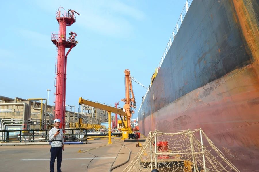 海湾港务HW1#泊位为3万吨级液体化工专用泊位(水工结构兼顾 8 万吨级),配备先进的管道直输系统,可实现液碱 “船—管道—厂”无缝衔接。本次靠泊过程中,调度团队通过预排计划将船舶在港时间压缩至90小时,较传统模式提升效率 25%。