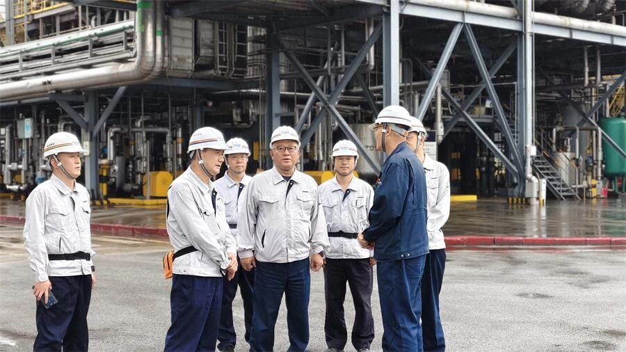 在海湾精化,李明深入生产一线,现场检查双乙烯酮等生产装置的运行情况,并与化工一厂负责人现场交流甲酯精馏装置优化改造情况。他指出,要保障裂化装置满负荷运行,依托装置优化改造成果、装置规模效益及精益化操作等优势,进一步降低醋酸消耗,提高产品市场竞争力;要稳扎稳打,稳步推进甲酯精馏装置运行调试,在满足客户质量需求的前提下,持续降低原料消耗等生产成本,找到质量和成本的最优平衡点。